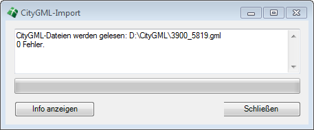 Nach der Bestätigung der Dateiauswahl wird das Protokollfenster CityGML-Import geöffnet, welches zunächst das Einlesen der CityGML-Datei anzeigt. Konnte die Datei fehlerfrei eingelesen werden, erscheint der Konfigurationsdialog, welcher zur Auswahl der Daten und deren Darstellung dient.
