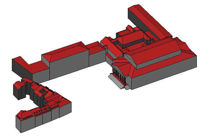 Hinweis: Gebäude, die über keine externen Texturen verfügen, weisen einfarbige Standard-Materialzuweisungen auf. Das Dach hat dann immer das Material 'RoofMaterial' und die Wände 'WallMaterial'. Daher resultieren auch die Standardfarben Rot für das Dach und Grau für Wände. Einige Modelle heben die Sohle eines Gebäudes mit dem Material 'GroundMaterial' in Grün hervor. Die Zuweisung des Materials zu den Gebäudeflächen kann über das Eigenschaftsfenster im CAD-System geändert werden. |