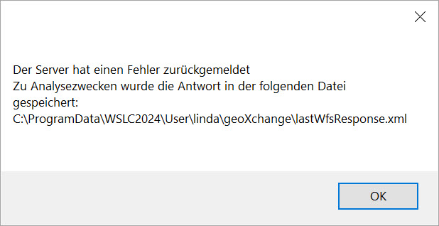 In allen Fällen wird die Fehlerdatei lastWfsResponse.xml in das jeweilige Userverzeichnis von GeoXchange geschrieben: Beispiel: C:\ProgramData\WSLC2024\User\Benutzername\geoXchange\lastWfsResponse.xml. Diese Fehlerdatei kann dem Support möglicherweise einen Hinweis auf den jeweiligen Fehler liefern. |