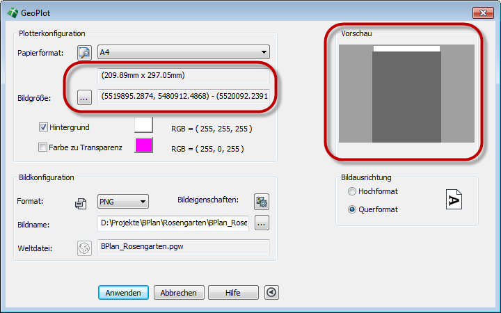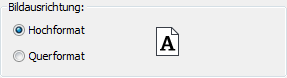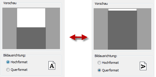 Durch Betätigung des Icons für das Papierformat erhalten Sie auch eine generelle Vorschau auf das gewählte Format durch das verwendete CAD-Programm. Im Dialogbereich Bildausrichtung kann hierbei zwischen Hochformat und Querformat gewechselt werden. |