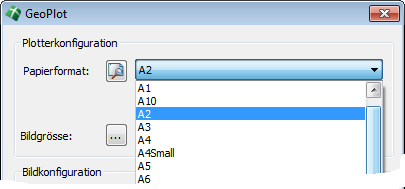 Die Plotterkonfiguration wird im oberen Teil des Dialoges eingestellt. Wählen Sie zunächst ein geeignetes Papierformat aus der Klappliste aus. Diese enthält alle in Windows verfügbaren Blattformate.