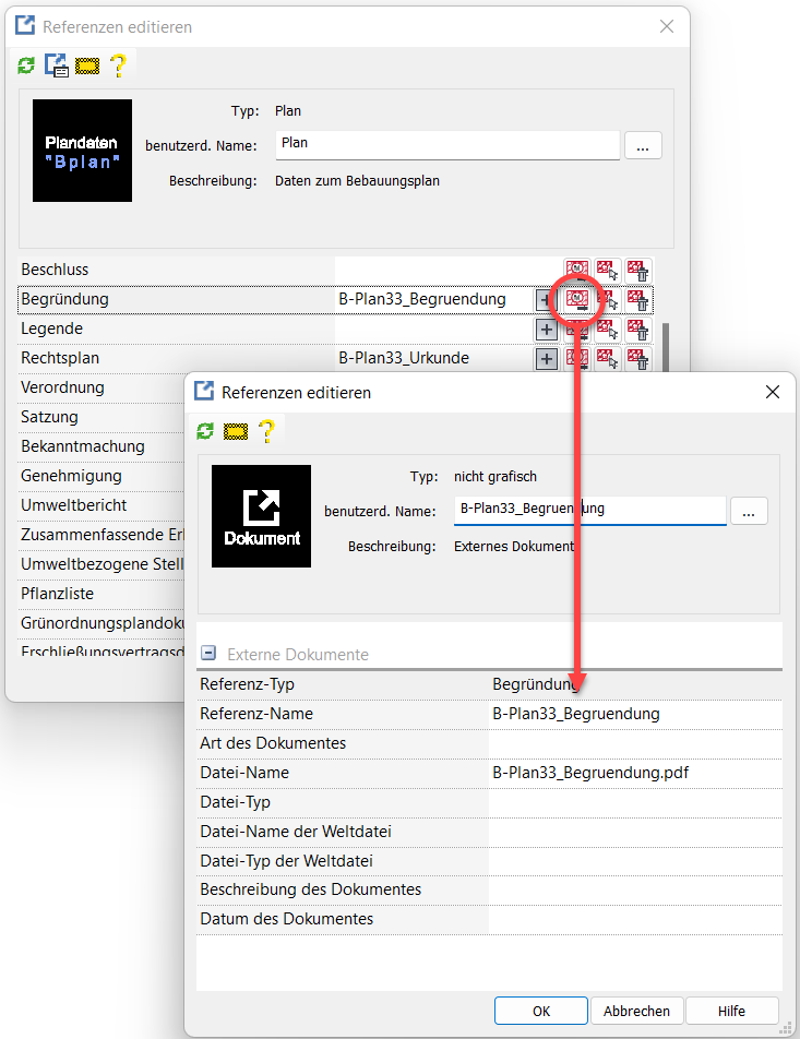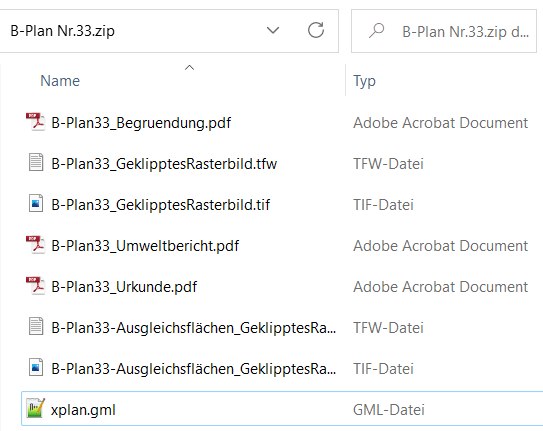 Einige Kommunen fordern die Abgabe der GML-Datei integriert in ein ZIP-Archiv. Dieses Archiv soll neben der eigentlichen GML-Datei zusätzlich die referenzierten Dateien enthalten. Die Referenzen ergeben sich aus den Referenztypen die gegebenenfalls im Projektbrowser zum Plan oder Bereich definiert wurden (siehe Bauleitplanung → Kapitel Referenzen → Referenzen editieren). Die Option XPlan-Übertragungspaket erstellen generiert ein solches Zip-Archiv.