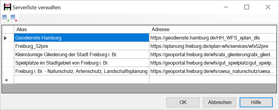Die Serverliste listet alle aktuell eingerichteten Serveradressen auf, unter denen der jeweilige WFS-Dienst verfügbar ist. Zur Adresse kann ein Alias vergeben werden. Der Alias ist eine manuell vergebbare Bezeichnung, unter welcher der Server in der Klappliste der Dialogbox Server wählen erscheint. Wird kein Alias vergeben, erscheint stattdessen die gesamte Serveradresse in der Auswahl.