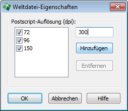 Bei der Ausgabe in das EPS-Format ist die Schaltfläche der Weltdatei freigegeben. Ein Klick auf das Icon öffnet die Dialogbox Weltdatei-Eigenschaften, mit deren Hilfe mehrere Postscript-Auflösungen ausgewählt werden können. Bei Bedarf können Sie auch neue Auflösungswerte in das Eingabefeld eintragen und zur Liste hinzufügen oder vorhandene Werte aus der Liste entfernen. Für alle in der Liste aktivierten Werte werden entsprechende Weltdateien erstellt. So können Sie mit Hilfe eines geeigneten Bildbearbeitungsprogramms später verschiedene Pixelbilder mit den jeweiligen Auflösungen erstellen. |