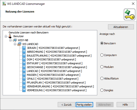 Anmerkung: Die Nutzungsübersicht ist v. a. für Netzlizenzen praktisch, da die Modulnutzung von jedem Anwender namentlich eingesehen werden kann. Dadurch kann z. B. ein anderer Anwender gebeten werden, ein Modul, welches er z. Zt. nicht benötigt, wieder freizugeben. |