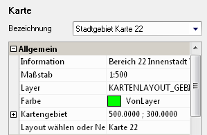 Bitte geben Sie einen kurzen Informationstext in das dafür vorgesehene Feld ein und wählen Sie den Maßstab aus der Klappliste oder tragen Sie ihn direkt in das Feld ein. Das Kartengebiet wird mit einem Rechteck dargestellt, welches im Modellbereich den Kartenausschnitt definiert und im Papierbereich das Ansichtsfenster bildet. Der Layer des Kartengebietes wird mit Hilfe der zentralen Layersteuerung festgelegt. |