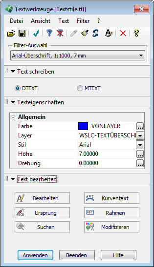 Die Textwerkzeuge in WS LANDCAD stellen einen bequemen Zugriff auf praktische, in der Zeichenpraxis äußerst hilfreiche Funktionen rund um das Thema „Text“ zur Verfügung und erweitern die Möglichkeiten der Textbearbeitung erheblich. Der Hauptdialog ist neben der Filterauswahl in drei wesentliche Bereiche gegliedert, welche bei Bedarf auf- und zugeklappt werden können.