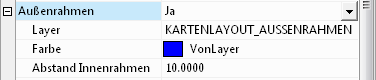 Ein Außenrahmen ist auch die Voraussetzung zur Generierung von Gitterstrichen im Rahmen. Der Layer des Außenrahmens wird mit Hilfe der zentralen Layersteuerung festgelegt. Sobald Sie in das Layerfeld klicken, erscheint eine gepunktete Schaltfläche [...], welche die zentrale Layersteuerung öffnet, mit deren Hilfe Sie einen Vorgabelayer spezifizieren können. Auf die gleiche Art lässt sich die Farbe spezifizieren, falls diese nicht den empfohlenen Standardwert VonLayer besitzen soll.