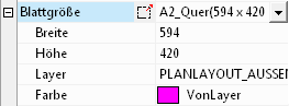 Der Layer der Blattmarkierung (der Außenrahmen) wird mit Hilfe der zentralen Layersteuerung festgelegt. Sobald Sie in das Layerfeld klicken, erscheint eine gepunktete Schaltfläche [...], welche die zentrale Layersteuerung öffnet, mit deren Hilfe Sie einen Vorgabelayer spezifizieren können. Auf die gleiche Art lässt sich die Farbe spezifizieren, falls diese nicht den empfohlenen Standardwert VonLayer besitzen soll.