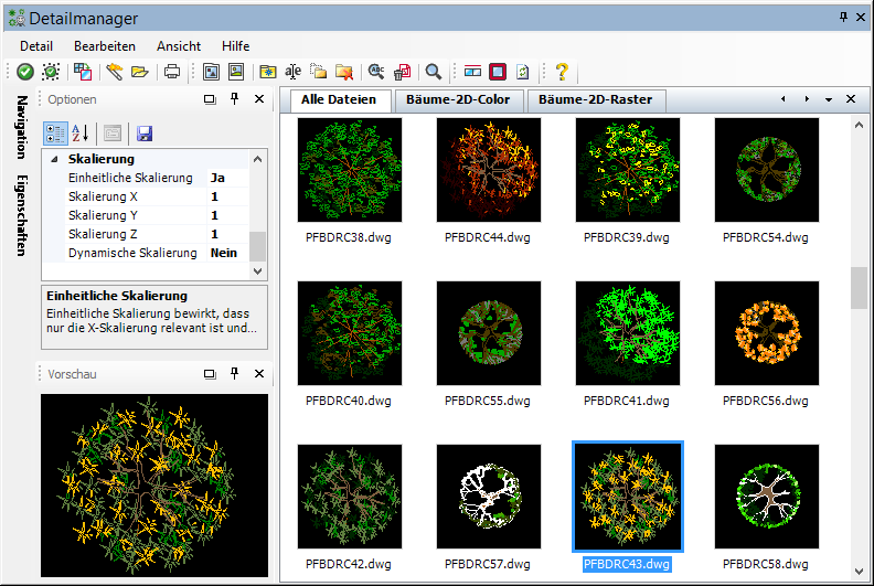- Die Manager können aus anderen Programmen heraus zur Auswahl eines Objektes (z. B. eines Details oder eines Schraffurmusters) aufgerufen werden. In diesem Modus sind die Manager modal und besitzen eine unabhängige Konfiguration, d. h. die Größe, der Aufbau und das Aussehen können separat (z. B. minimalistisch) gestaltet werden.