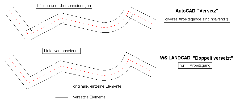Dieser im praktischen Zeichenbetrieb äußerst hilfreiche Editierbefehl erzeugt einen beidseitigen, gleichmäßigen Versatz bei Kreisen, Polylinien, Bögen, Linien sowie einer Abfolge aus diesen Elementen. Abgesehen vom doppelten Versatz bietet der Befehl den entscheidenden Vorteil der mehrfachen Auswahl sowie des gleichmäßigen Versatzes von Einzelelementen ohne lästige Aussparungen oder Überschneidungen.