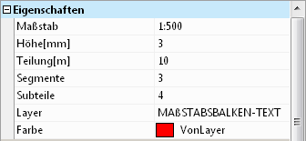 - Layer - Der Layer des Maßstabsbalkens wird mit Hilfe der zentralen Layersteuerung festgelegt. Sobald Sie in das Layerfeld klicken, erscheint eine gepunktete Schaltfläche [...], welche die zentrale Layersteuerung öffnet, mit deren Hilfe Sie einen Vorgabelayer spezifizieren können. Auf die gleiche Art lässt sich die Farbe spezifizieren, falls diese nicht den empfohlenen Standardwert VonLayer besitzen soll.
