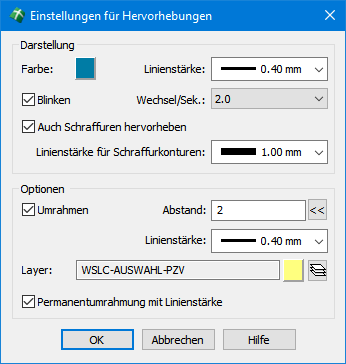 Anmerkungen: Die Einstellungen für Hervorhebungen können für jedes WS LANDCAD-Modul separat vorgenommen werden. Dies ist sinnvoll, da je nach Modul oft in stark voneinander abweichenden Maßstäben bzw. Größenordnungen gearbeitet wird und die Einstellungen für z. B. die Bauleitplanung nicht unbedingt zu der einer Pflanzplanung passen. |