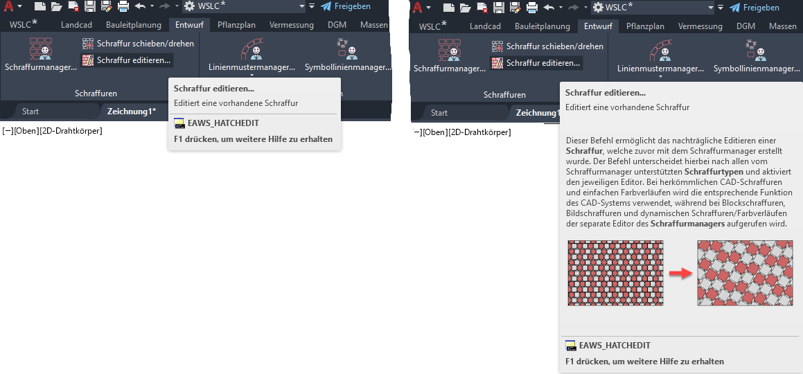 Kurze Tooltipps erscheinen zu einem Befehl, nachdem der Cursor eine kurze Zeit über dem Icon verweilt. Kurz darauf erscheint ein erweiterter Tooltipp, welcher neben einem erklärenden Text auch Grafik beinhalten kann. Erweiterte Tooltipps stehen in WS LANDCAD für alle Befehle zur Verfügung, wobei oft zusätzliche Grafiken enthalten sind, die auf anschauliche Art und Weise einen Zusammenhang verdeutlichen. Erweiterte Tooltipps stehen für Werkzeugkästen und Multifunktionsleisten zur Verfügung.
