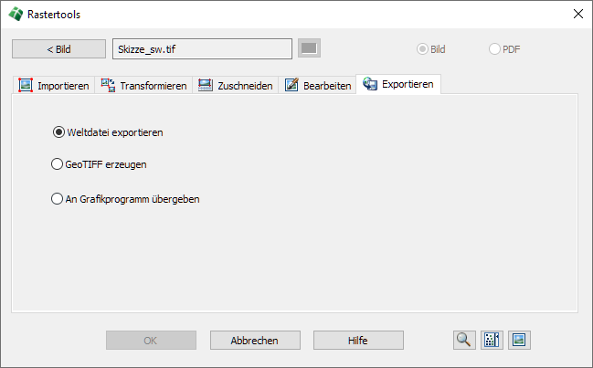 - Weltdatei exportieren – Diese Funktion erzeugt eine Weltdatei zur externen oder späteren Wiederverwendung. Hierbei wird die bereits beschriebene Namenskonvention befolgt, d. h. die Weltdatei erhält den gleichen Namen wie das Pixelbild und eine dem Format entsprechende Dateierweiterung. Ist eine gleichnamige Datei bereits vorhanden, erfolgt eine Abfrage, ob die Datei überschrieben werden soll. Falls nicht, wird der Dateidialog zur Eingabe eines neuen Namens geöffnet.