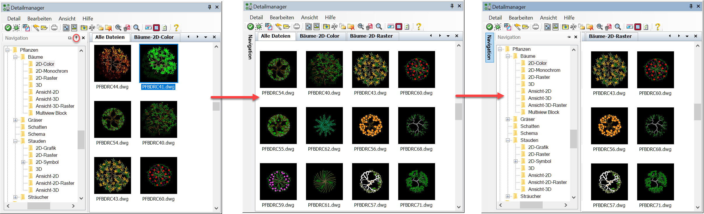 Die Minimierung eignet sich ganz besonders für das Navigationsfenster sowie generell auch für Fenster, die seltener benötigt werden. Es lassen sich mehrere Fenster gleichzeitig an einer Dialogkante minimieren.