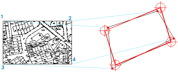 In Abhängigkeit des Pixelbilds oder der PDF-Unterlage entsprechen die tatsächlichen Zielpunkte nicht immer den ausgewählten Zielpunkten. Der daraus resultierende Fehler wird als numerischer Wert im Dialog angegeben, nachdem die Kontrollpunkte eingegeben wurden. |