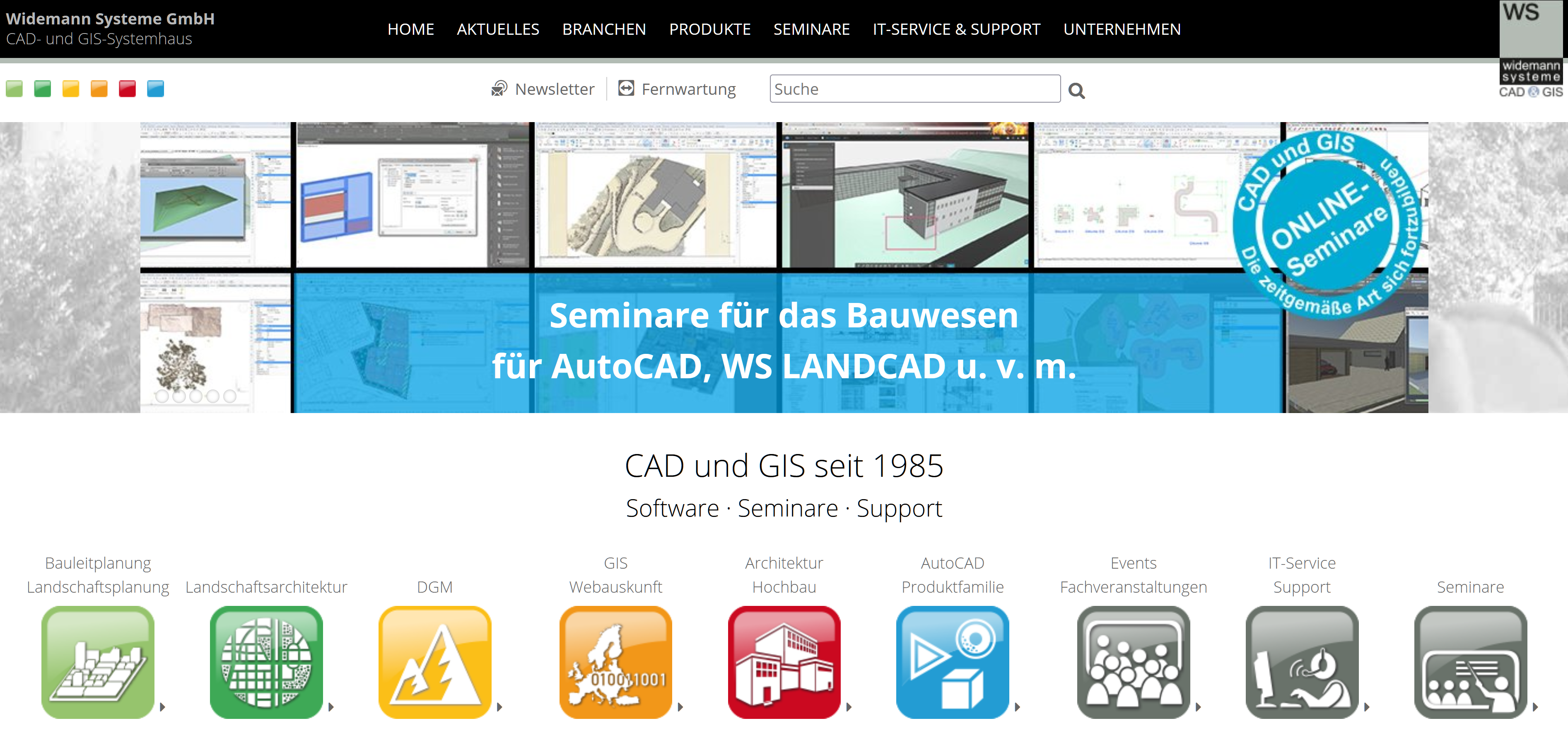 Die Homepage der Widemann Systeme GmbH (www.widemann.de) bietet umfangreiche Informationen und stellt alle wichtigen Downloads für WS LANDCAD zur Verfügung. Darüber hinaus finden Sie ausführliche Informationen zur gesamten Produktpalette. Über die Homepage sind u. a. auch Seminartermine, Produktprospekte, die Fernwartung und Live-Präsentationen verfügbar. |