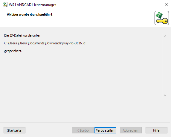 Mit dieser Funktion wird eine Identifikations-Datei (*.id) des jeweiligen Rechners erstellt. Eine ID-Datei wird für das Auslagern von Lizenzen für andere Rechner benötigt, d. h. dann, wenn die Auslagerung nicht vom/für den aktuellen Arbeitsplatz-Rechner (aus) erfolgt. Sie gelangen in den Standard-Dateidialog, mit dessen Hilfe Sie die Datei, deren Name per Vorgabe aus dem Rechnernamen ermittelt wird, speichern können. Der Rechnername ist vorteilhaft, aber nicht bindend. Nach dem Speichern erhalten Sie eine entsprechende Rückmeldung des Lizenzmanagers.