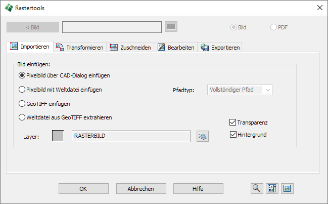 Die Verwendung von Pixelbildern fängt mit dem Import an. Da ein CAD-System hier i. d. R. nur eingeschränkte Möglichkeiten bietet, beinhalten die Rastertools weitere, praxisgerechte Optionen. Die sonst obligatorische und für alle anderen Tabs gültige Bildauswahl aus der Zeichnung (oberer Dialogrand) ist hier ausgegraut. Der Layer, welcher per zentraler Layersteuerung angesprochen wird, gilt unabhängig von der Einfügeart. Die Schalter Transparenz und Hintergrund sind per Vorgabe aktiviert und sorgen dafür, dass die Hintergrund-Transparenz eingeschaltet und das Pixelbild automatisch in den Hintergrund gelegt wird.