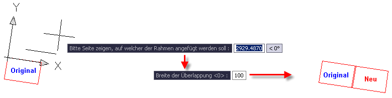 Nach dem Befehlsaufruf ist zunächst eine vorhandene Kartengebietsbegrenzung zu zeigen. Anschließend müssen Sie eine der vier Seiten zeigen, an die das neue Gebiet angehängt werden soll. Ein abschließend einzugebender Überlappungswert größer als 0 erlaubt die automatische Überlappung der Kartenbereiche. Ein negativer Überlappungswert hingegen erzeugt einen Abstand zwischen den Gebieten.