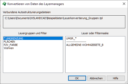 Wurde die Konvertierungsroutine Layergruppen gestartet (EAWS_LM_CONVERT), öffnet sich der Dialog Konvertieren von Daten des Layermanagers. Es werden alle gefundenen Layergruppen und Filter aufgelistet. Durch Anklicken einer Layergruppe oder eines Filters links, erfolgt eine Übersicht über die dazugehörigen Layer und/oder Filtermasken auf der rechten Seite. Im oberen Teil des Dialogs werden die mit der Zeichnung verbundenen Autostrukturierungsdateien angezeigt.