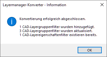 Wird der Dialog mit OK bestätigt, erscheint im Anschluss eine Hinweismeldung über das Ergebnis der Konvertierung. Neue Layergruppenfilter und Layereigenschaftenfilter werden ergänzt, bereits vorhandene Layergruppenfilter werden aktualisiert und bereits vorhandene Layereigenschaftenfilter berücksichtigt.