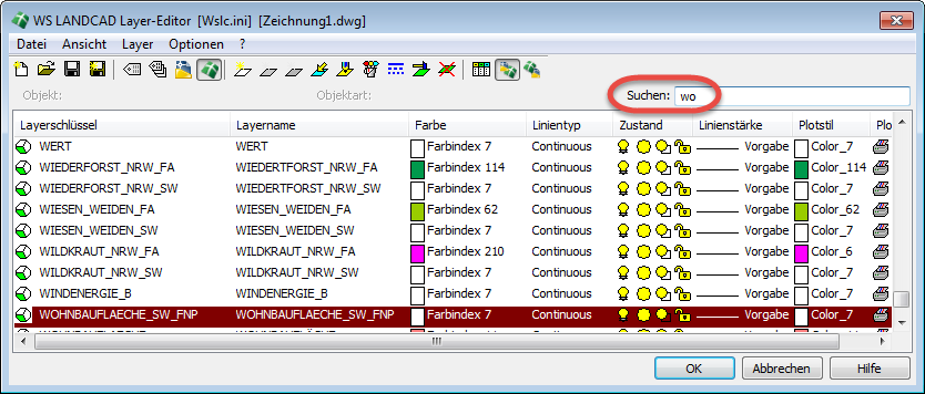 Besonders bei großen Layerlisten kann es mitunter recht umständlich sein, zu einem gewünschten Layereintrag zu scrollen. Sie können daher im Editierfeld "Suchen:" die Anfangsbuchstaben des Layers eingeben, wobei sich der Layerdialog automatisch auf den ersten Layereintrag positioniert, der mit der Sucheingabe beginnt. Für den Suchbegriff wird Groß- und Kleinschreibung ignoriert. Wildcards, z. B. *, sind nicht zulässig.