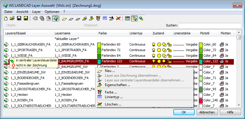 WS LANDCAD besitzt eine zentrale, benutzerabhängige Layersteuerung, auf die insbesondere die grafischen Manager, aber auch viele andere Programmteile, zurückgreifen. Diese Layersteuerung hat im Wesentlichen die Aufgabe, objektbezogene Vorgabelayer für die verschiedensten Operationen, z. B. das Einfügen eines Details, eines Planzeichens oder das Zeichnen einer Vegetationslinie, zur Verfügung zu stellen. Die zentrale Layersteuerung wird durch die Schaltfläche LAYER in den jeweiligen Dialogboxen einer WS LANDCAD-Funktion automatisch aktiviert, ist aber auch unabhängig davon durch Betätigung des Befehls Layer→Layersteuerung aufrufbar. Wird die Layersteuerung aus dem Menü heraus aufgerufen, so geschieht dies nicht objektbezogen, d. h. es können keine Layereinträge für ein bestimmtes Objekt zugewiesen werden. Vielmehr dient der Aufruf hierbei zu Kontrollzwecken sowie zum unabhängigen Aufbau oder der Bearbeitung einer Layersteuerdatei. Das Thema der Layersteuerung wird ausführlich im Kapitel "Die zentrale Layersteuerung" behandelt.