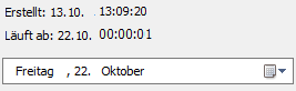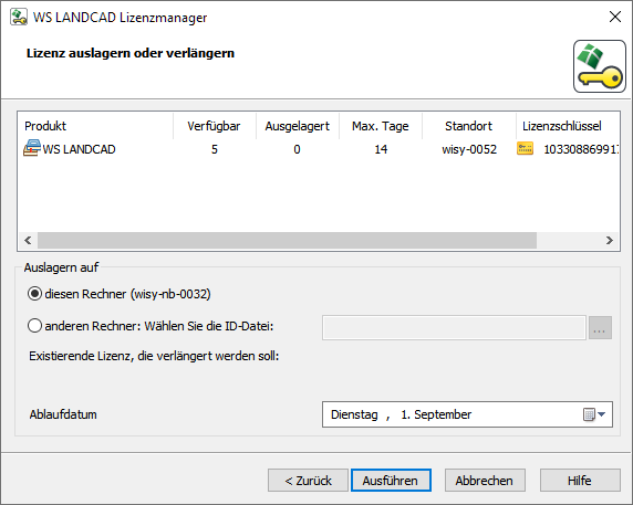 Befindet sich bereits eine ausgelagerte Lizenz auf dem Rechner, wird das Erstellungs- und Ablaufdatum angezeigt. Die Auslagerung kann im Bedarfsfall verlängert werden. Der Vorgang ist hierbei identisch. |