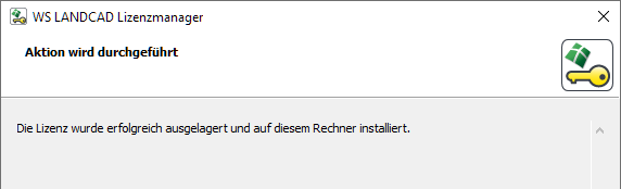 Durch Betätigung der Schaltfläche Ausführen wird die Lizenz ausgelagert bzw. verlängert und Sie erhalten eine entsprechende Bestätigung durch den Lizenzmanager.