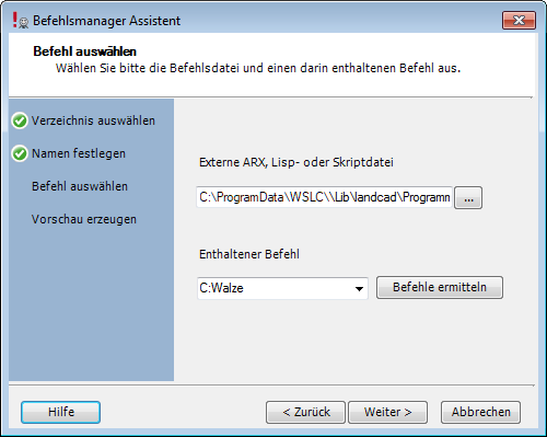 Im dritten Schritt wird zunächst die ausführbare Programmdatei gewählt, die den gewünschten Befehl enthält. Hierbei werden ARX, Lisp- und Scriptdateien unterstützt. Nach der Auswahl ist die Schaltfläche Befehle ermitteln zu betätigen, welche alle in einem Programm enthaltenen Befehle (C:) analysiert und in die Klappliste einträgt. Sie können nun den gewünschten Befehl in der Liste wählen. Sind keine C:-Befehle enthalten, können Sie den Befehl oder die Funktion auch direkt in das Feld Enthaltene Befehle eintragen. Auch die Editierung gefundener und ausgewählter Befehle ist ohne weiteres möglich. |