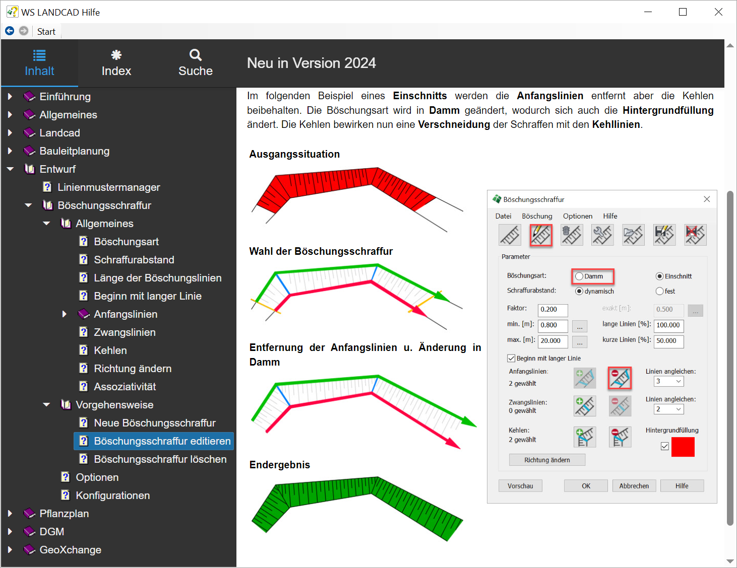 Diese Hilfedatei beschreibt in ausführlicher Form wesentliche Änderungen und Erweiterungen von WS LANDCAD 2024 gegenüber der Version 2023 und soll Ihnen dabei behilflich sein, so schnell wie möglich einen Einstieg in das neue Release zu erhalten. Im Kapitel Überblick werden Sie bei Bedarf zu einer Kurzversion weitergeleitet. Im Kapitel "Service Packs" sind zu gegebener Zeit auch Informationen über eventuell verfügbare Service Packs für dieses Release enthalten.