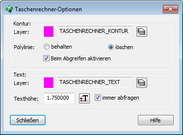 Alle wesentlichen Einstellungen für die Zusatzfunktionen des Taschenrechners lassen sich durch den Aufruf des Options-Dialoges festlegen. Im Bereich Kontur lässt sich mit Hilfe der zentralen Layersteuerung ein Vorgabelayer für die Kontur einstellen, welche bei der automatischen Konturverfolgung der Flächenermittlung entsteht. Über Optionsschalter lässt sich festlegen, ob eine erzeugte Kontur nach dem Verlassen des Taschenrechners wieder automatisch gelöscht und ob Konturen auch beim Abgreifen, z. B. von Strecken und Abständen, gezeichnet werden. |