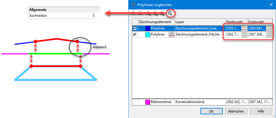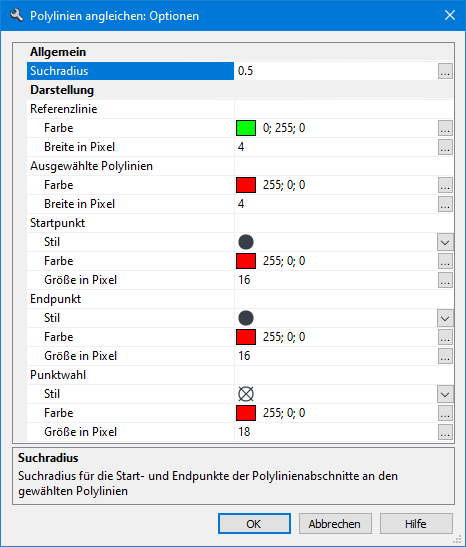 - Suchradius – Hierüber wird gesteuert, in welchem Radius nach einem Start- und Endpunkt für den Referenzbereich gesucht werden soll. Je nachdem welcher Wert eingestellt ist, ist es möglich, dass bereits Start- und Endpunkte automatisch gefunden werden und direkt im Dialog Polylinien angleichen vorgeschlagen werden. Damit die Auswahl kontrollierbar bleibt, sollten möglichst realistische Werte festgelegt werden. Der Ausgangswert ist 0.5.
