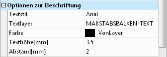 Hier werden die Parameter zur Beschriftung des Maßstabsbalkens eingestellt. Die Texthöhe kann entweder direkt in das Feld eingegeben oder aus einer Liste der vordefinierten Texthöhen gewählt werden, wobei hierfür die zentrale Texthöhen-Funktion verwendet wird. |