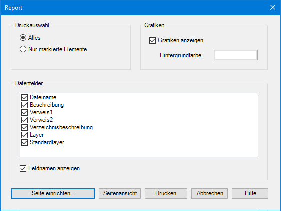 Mit dieser Funktion lässt sich z. B. zu Dokumentationszwecken ein variabel gehaltener Report drucken. Der Druck muss nicht zwangsweise auf Papier erfolgen, sondern kann durch Auswahl eines entsprechenden Druckertreibers auch in eine Datei, z. B. in ein PDF-Dokument, erfolgen. Vor dem Aufruf der Funktion ist zunächst das gewünschte Register zu aktivieren. Möchten Sie nicht alle, sondern nur markierte Objekte in den Report übernehmen, sind außerdem die gewünschten Objekte vorher zu selektieren.