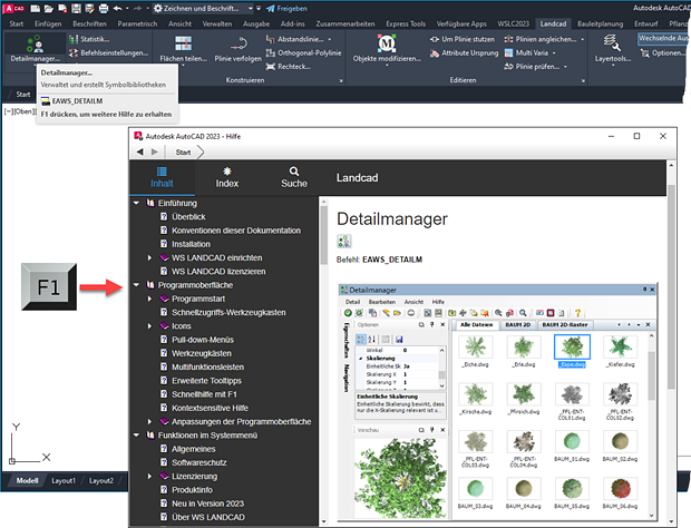 WS LANDCAD verfügt unter AutoCAD über eine Schnellhilfe, die durch Drücken der Funktionstaste F1 verfügbar ist, sobald ein Tooltipp zu einem Befehl erscheint. Hierbei wird direkt die Online-Hilfe zu dem jeweiligen Befehl aufgerufen, wobei bei umfangreichen Befehlen, die über mehrere Kapitel verfügen, jeweils zum betreffenden Anfangs-Kapitel gesprungen wird. F1 bei einem Hilfe-Icon öffnet die Online-Hilfe zum jeweiligen Modul im Einführungs-Kapitel. Die Anzeige der HTML-Hilfe erfolgt systembedingt in einem modifizierten AutoCAD-Hilfefenster.