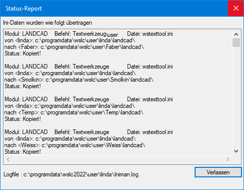 Hinweis: Um Benutzerdateien zu übertragen, müssen diese auch tatsächlich vorhanden sein. Da die jeweiligen Benutzerdaten erst eingerichtet werden, wenn eine entsprechende WS LANDCAD-Funktion mindestens einmal aufgerufen wurde, können im Status-Report Meldungen erscheinen, dass eine Quelldatei nicht vorhanden ist.
