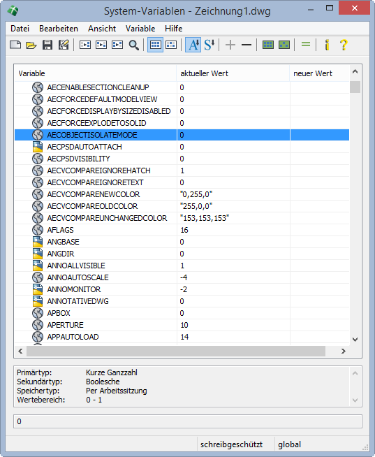 Anmerkung: Einige Systemvariablen sind sogenannte read-only Variablen - diese können nicht verändert werden. Sie erkennen diese Variablen an der grauen Hinterlegung im Dialog. Des Weiteren erscheint der Status schreibgeschützt am unteren Dialogrand, sobald Sie eine schreibgeschützte Variable anklicken. |