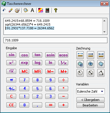 Der integrierte Taschenrechner bringt die wichtigsten Funktionen für häufige Berechnungen mit und ist zudem in der Lage, Zeichnungswerte direkt aus ihrer aktuellen Zeichnung abzugreifen, um mit diesen Werten zu operieren. Im Gegensatz zum AutoCAD-internen Taschenrechner sind die Operationen mit der Zeichnung vielfältiger und das Resultat der Berechnung kann als Text in der Zeichnung erzeugt werden, um z. B. das Ergebnis einfacher Flächenberechnungen zu kennzeichnen. Darüber hinaus lassen sich die Werte auch direkt an AutoCAD übergeben, um geforderte Eingaben mit den berechneten oder abgegriffenen Werten auszuführen. Der Taschenrechner verfügt über einen permanenten Dialog und wird über das Menü transparent aufgerufen, d. h. Sie können den Taschenrechner innerhalb eines Zeichenbefehls nutzen. |