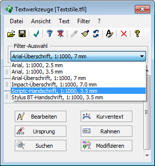 Die Textwerkzeuge bedienen sich sog. Filter, um auf die gewünschten Eigenschaften zurückzugreifen. Ein Textfilter stellt hierbei die Summe aller festgelegten Texteigenschaften dar. Filter werden benannt und in einer Filterdatei gespeichert, wobei in einer Filterdatei beliebig viele Filter enthalten sein können. Eine Filterdatei kann über den Befehl Datei → Öffnen geladen werden, wobei deren Name anschließend in der Titelzeile des Dialoges in Klammern angezeigt wird. Die in der Filterdatei enthaltenen Filter können aus der Klappliste Filter-Auswahl selektiert werden. Nach der Selektion werden alle im Filter definierten Eigenschaften in die aktuellen Texteigenschaften des Dialoges übertragen. |