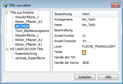 Anmerkung: Auf TINs des WS LANDCAD-DGMs oder von Civil 3D kann nur gezoomt werden. Alle anderen Funktionen sind dann nicht verfügbar. Bitte verwenden Sie die entsprechenden Befehle des DGMs, um solche TINs umzubenennen oder zu löschen. |