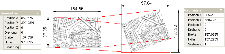 Bei der Transformation in der Bilddatei findet die Transformationen im Bild selbst statt. Dies bedeutet, dass der Bildinhalt selbst gedreht, uneinheitlich skaliert oder geschert wird. Dabei entsteht ein neues Pixelbild im ursprünglichen Format, wobei der ursprüngliche Dateiname mit einem fortlaufenden Suffix (z. B. Dateiname_1) versehen wird. Das neue Pixelbild wird von den Rastertools automatisch georeferenziert eingefügt. Bei einer Verwendung des Bildes und einer Weltdatei in externen Programmen sollte es hierbei keine Probleme geben, da das Bild selbst nicht mehr gedreht werden muss.