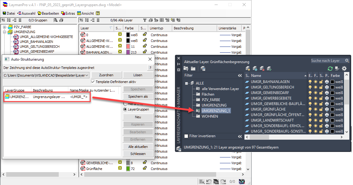Die Konvertierungsroutine kann mehrfach in einer Zeichnung angewendet werden. Alle gespeicherten Änderungen bezüglich der Layergruppen werden entsprechend nachgeführt.