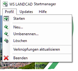 EinführungWS LANDCAD einrichtenWS LANDCAD-Startmanager Verknüpfungen aktualisieren Diese Funktion, die nur über das Pull-down-Menü "Profil" verfügbar ist, aktualisiert die Verknüpfungen zu einem gültigen und in der Liste selektierten WS LANDCAD-Profil, falls Sie z. B. eine Desktop-Verknüpfung versehentlich gelöscht haben.