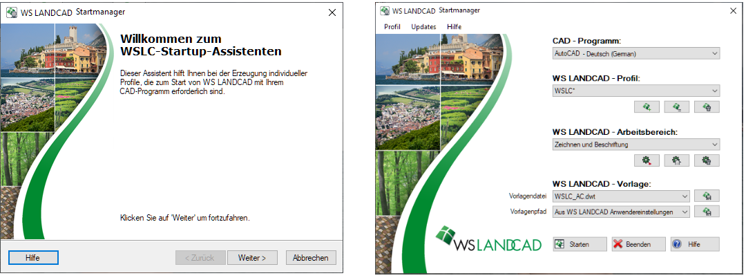 Ist noch kein gültiges WS LANDCAD-Profil vorhanden, wird der Startmanager im Assistenten-Modus geöffnet, in welchem der Anwender Schritt für Schritt durch die Profilerzeugung geleitet wird. Sobald ein gültiges Profil vorhanden ist, wird der Startmanager im Verwaltungs-Modus geöffnet, welcher eine Gesamtdarstellung der Profile und den Zugriff auf alle Funktionen bietet. |