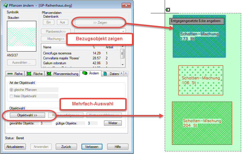 Sie können nun die Objektwahl vornehmen, wenn Sie mehr als eine Teilfläche ändern möchten. Für die Objektwahl können Sie alle gängigen Auswahlmethoden verwenden, wobei das Programm alle gültigen Objekte im Sinne der Pflanzenmischung, d. h. bereits zugeordnete Konturen, Pflanzschraffuren und Infoblöcke, herausfiltert. Zusammengehörige Elemente einer Teilfläche gelten hierbei als ein Objekt.