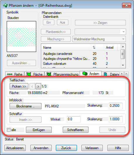 Alle Teilflächen einer Pflanzenmischung können entweder automatisch oder separat und einzeln geändert werden. Auch Kombinationen können angewendet werden, d. h. Sie können eine oder mehrere Teilflächen einzeln und die restlichen Teilflächen automatisch gemäß der aktuellen Teilfläche ändern. Die erste Teilfläche ist bereits vorgewählt. Gleichzeitig ist deren Kontur in der Zeichnung ausgegraut, damit Sie eine Kontrolle über deren Lage haben. Zwischen den Teilflächen kann jederzeit durch Picken der Flächen in der Zeichnung oder durch die Pfeilschalter < > gewechselt werden. Sie können nun alle Merkmale der Ausgestaltung beliebig ändern. Zwar ist das Schraffurmuster, nicht aber dessen Winkel und Skalierung ist fest. Die Änderungen sind, unabhängig ob diese einzeln oder für alle bzw. mehrere Teilflächen durchgeführt werden, stets assoziativ. So wird beim Einfügen eines Infoblockes, der alte Infoblock und eine dazugehörige Schraffur automatisch gelöscht und anschließend ebenso automatisch wieder schraffiert. |