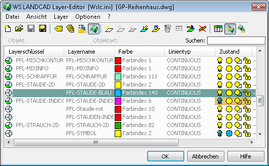 Die Verwendung temporärer Layer ist durchaus sinnvoll, da sie den Layer z. B. für Staudensymbole beliebig ändern können, ohne jedoch die Vorgabe zu überschreiben. Temporäre Layer, also Layer, die nicht als permanente Vorgabe gespeichert werden, können in der Pflanzplanung für Pflanzsymbole, Infoblöcke und Schraffuren verwendet werden. Die Verwendung temporärer Layer im Setup ist hingegen nicht zugelassen. Es ist jedoch auch möglich, den Layer der Elemente nachträglich, z. B. über den Eigenschaften-Dialog von AutoCAD, zu verändern. Auch in diesem Fall werden die veränderten Eigenschaften beibehalten, wenn Sie eine Pflanze über die Positionsliste oder durch das grafische Zeigen erneut wählen.